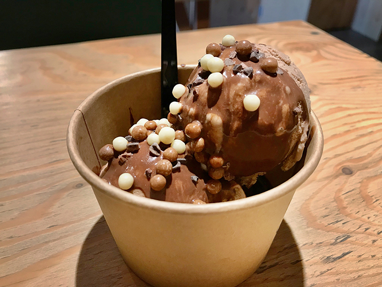 お好きなアイスクリーム2種とホイップ、チョコソース、カリカリのクリスパールで大満足な逸品。
