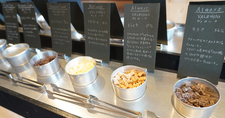 扱うクーベルチュールチョコレートは、フランスの「ヴァローナ」、ベルギーの「カレボー」、フランスの「ヴェイス」の全20種類。3社とも世界のショコラティエが信頼して選んでいるものだそう。