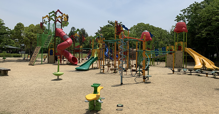大きなアスレチック遊具を備えた「ちびっこ広場」や水遊びのできる「はだかの池」、巨大すべり台がある芝生広場「はだしの森」などたくさんのプレイゾーンがあります。