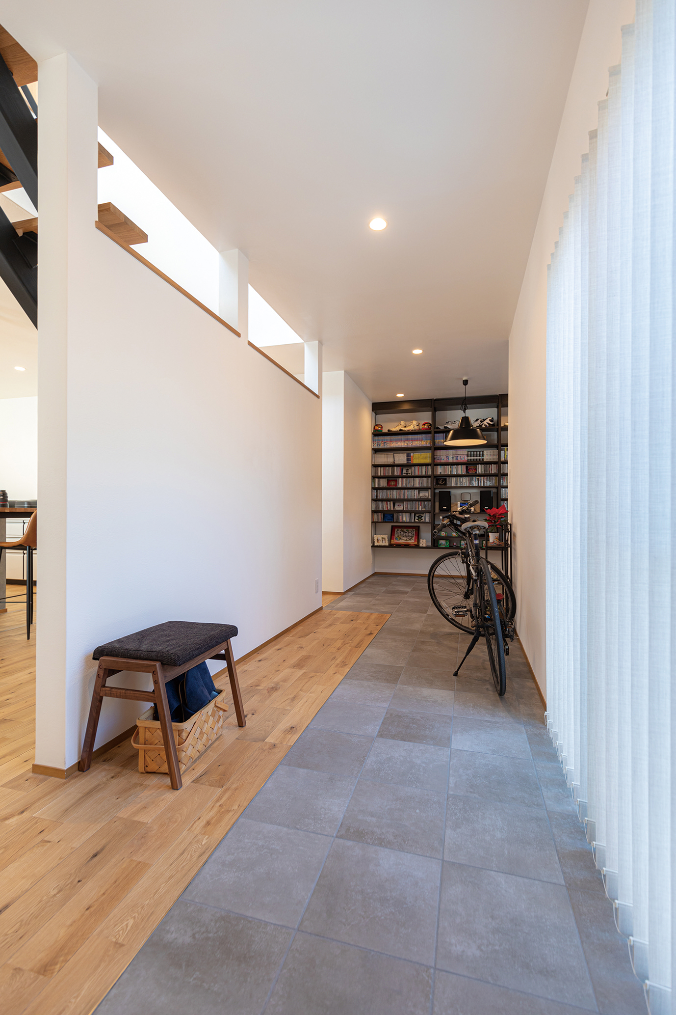 おしゃれなタイル貼りの土間。框を設けず、リビングともフラットに繋がるように。