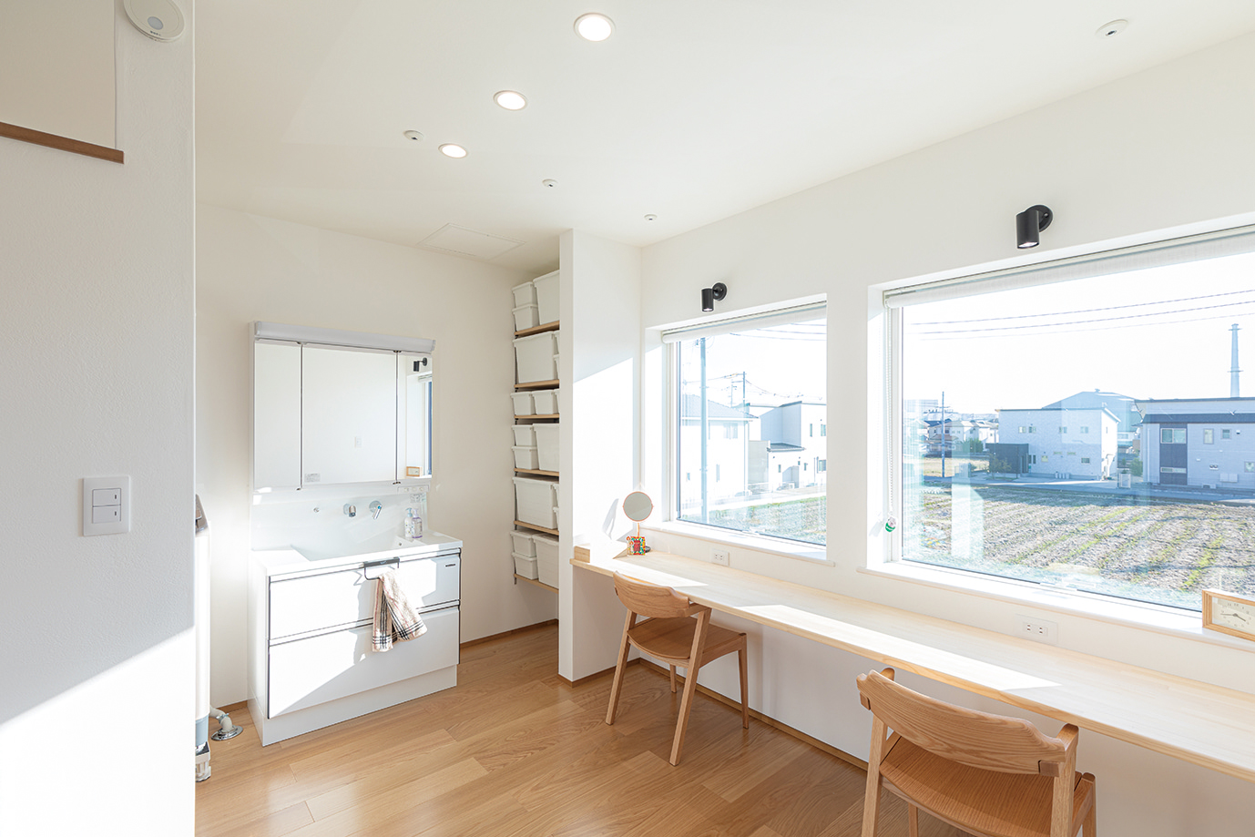 趣味カウンターと家族用洗面、洗濯スペースを一か所にまとめた2Fフリースペース。