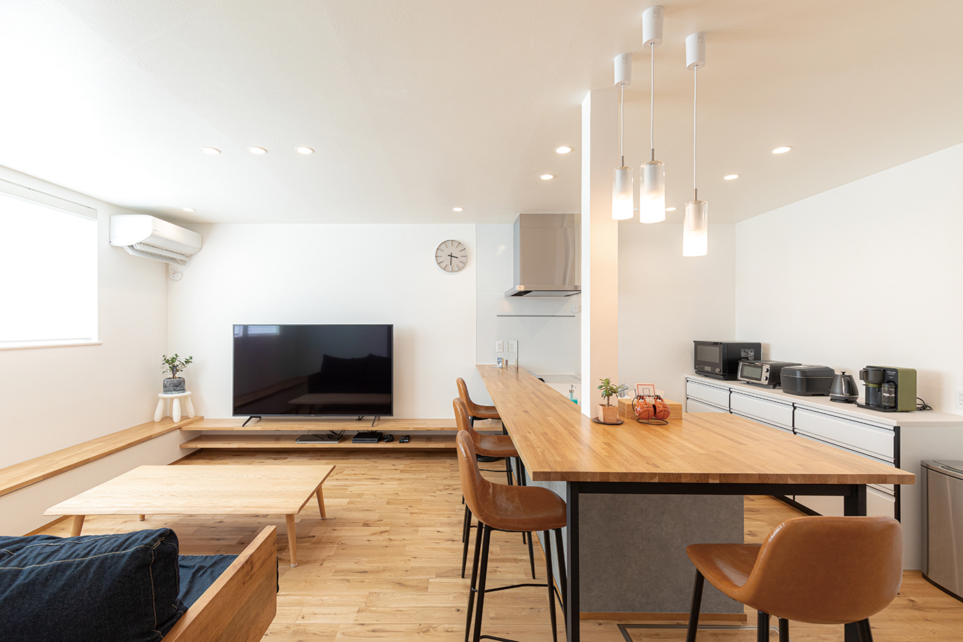 さらに、何処にでも座れるよう、リビングは収納付きのベンチを造作。キッチンにはハイカウンターを設けたことで、料理しながら来客をもてなすことができます。「開放的なのに冬も暖かく、年間電気代も安くなった」と住み心地にも満足されていました。