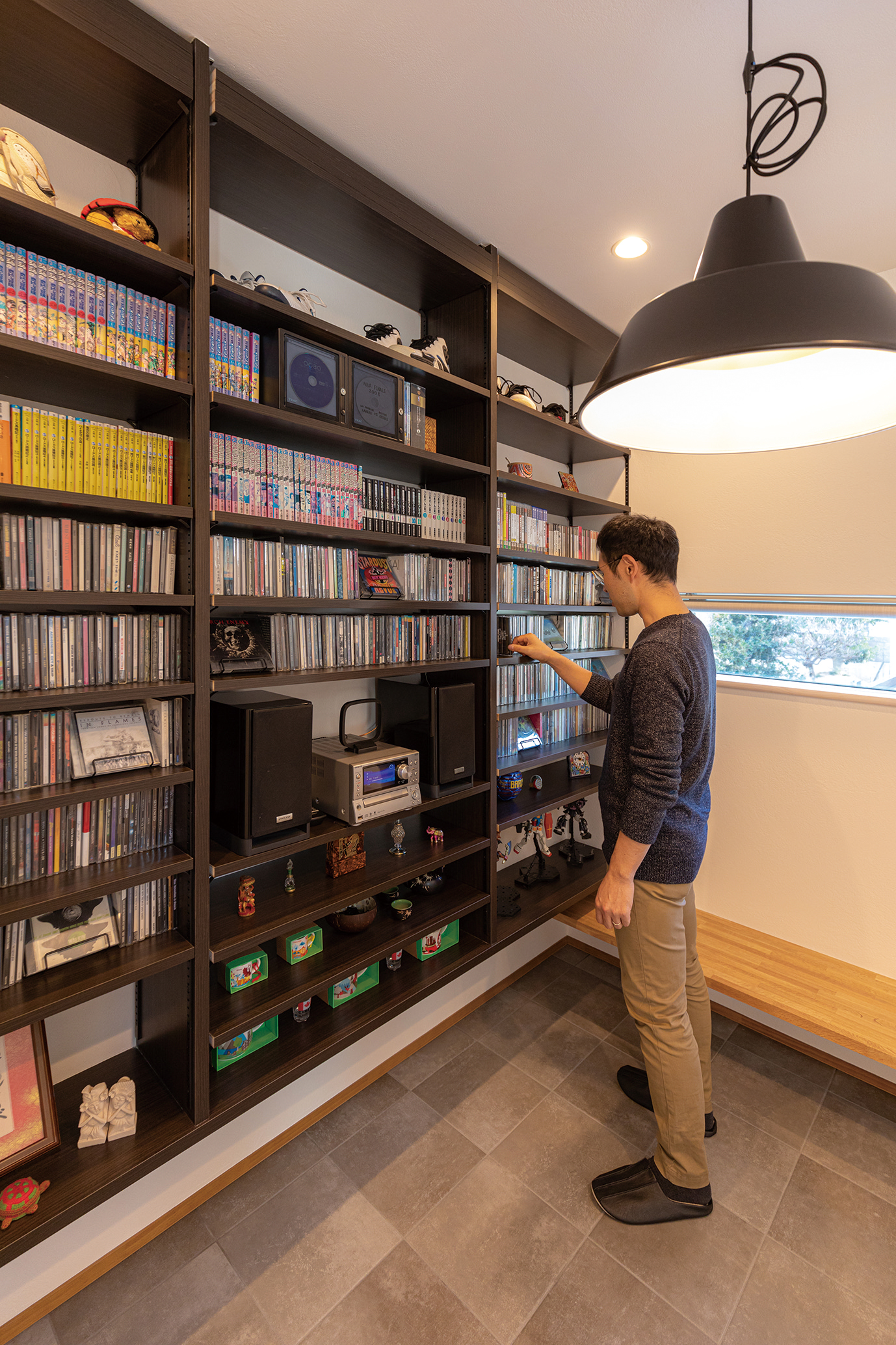 玄関土間続きの隠れ家的スペース『ヌック』。造作棚には600枚もCDが収納できます。