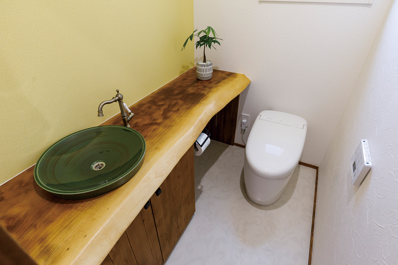 標準仕様の天然木一枚板カウンターが目を引くトイレは、同社のこだわりの空間づくり。