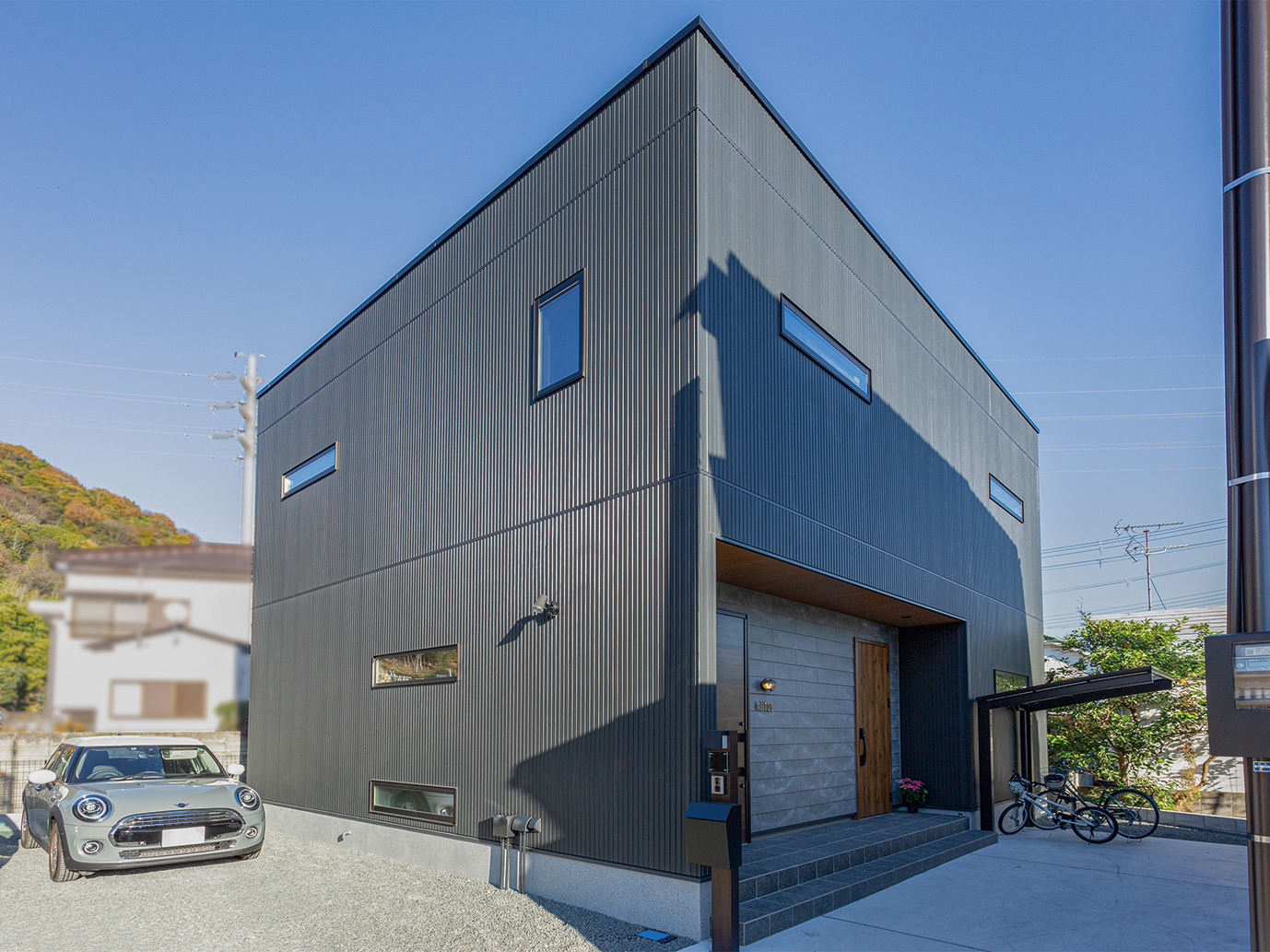 玄関のセメント壁が、時と共に移り変わり、おしゃれな風合いをプラスした外観