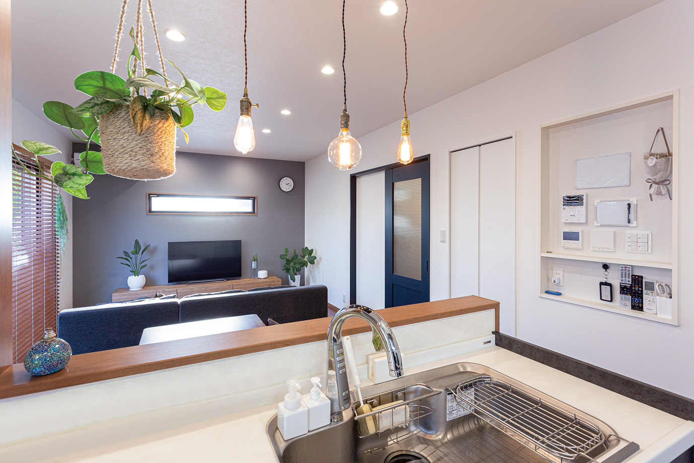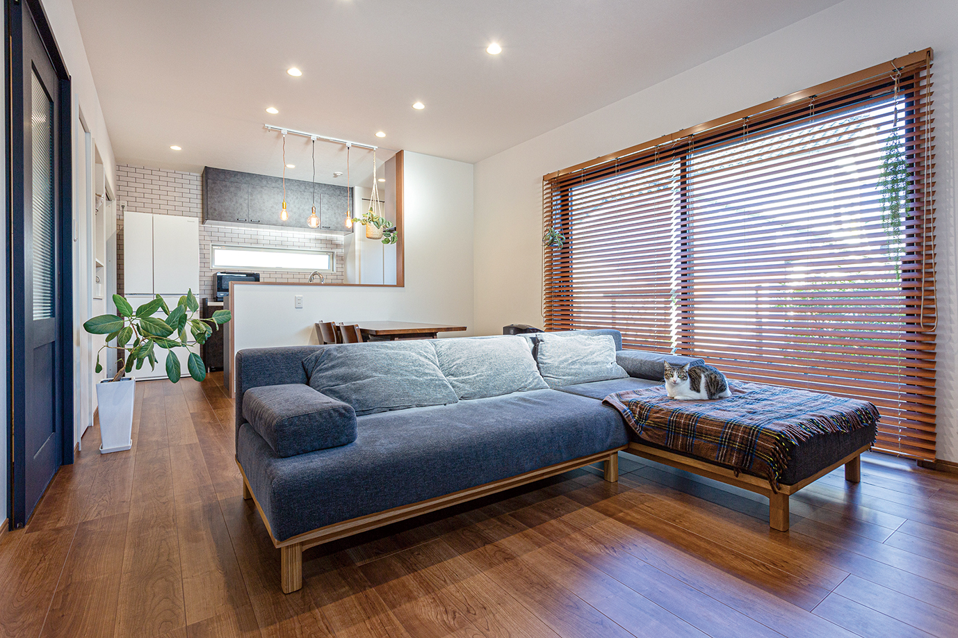 光が差し込む明るいLDK。ウッドブラインドの映えるシンプルですっきりとした空間に、ネイビーのドアやソファーでアクセントをプラス。