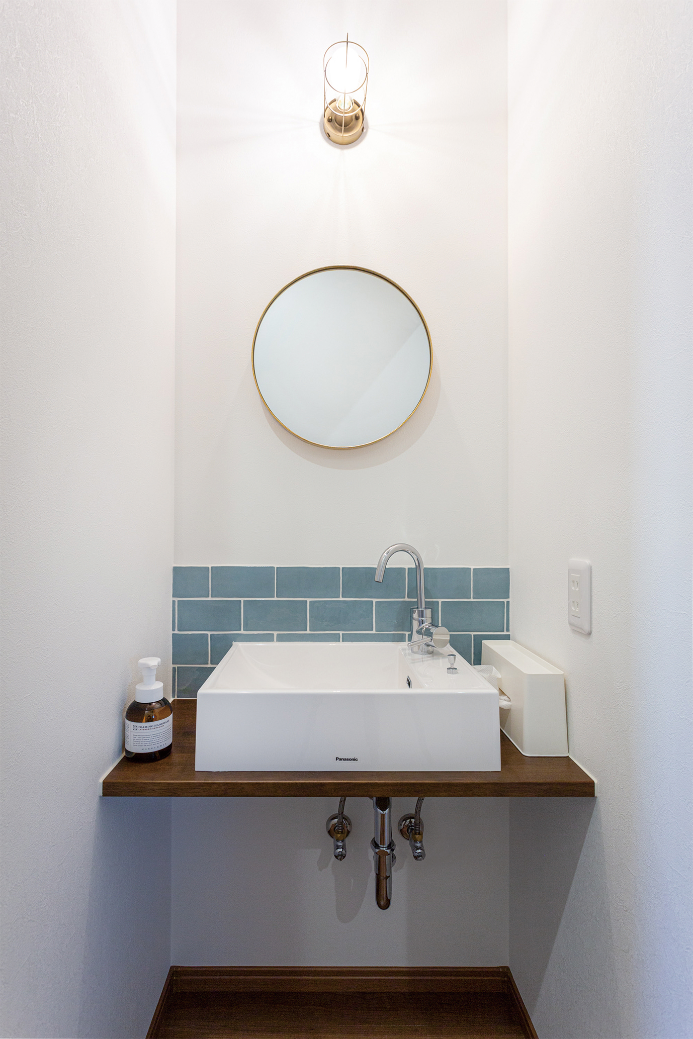 造作だからこそ出来るオシャレな洗面台。丸鏡とタイルがポイント。