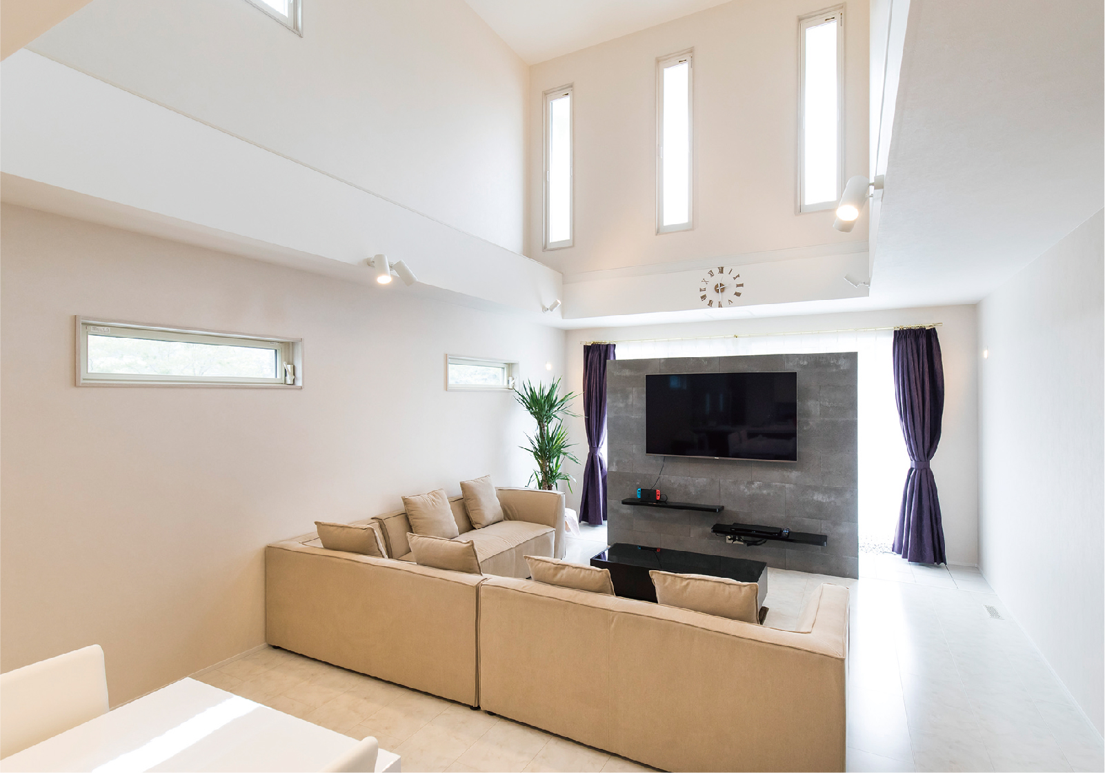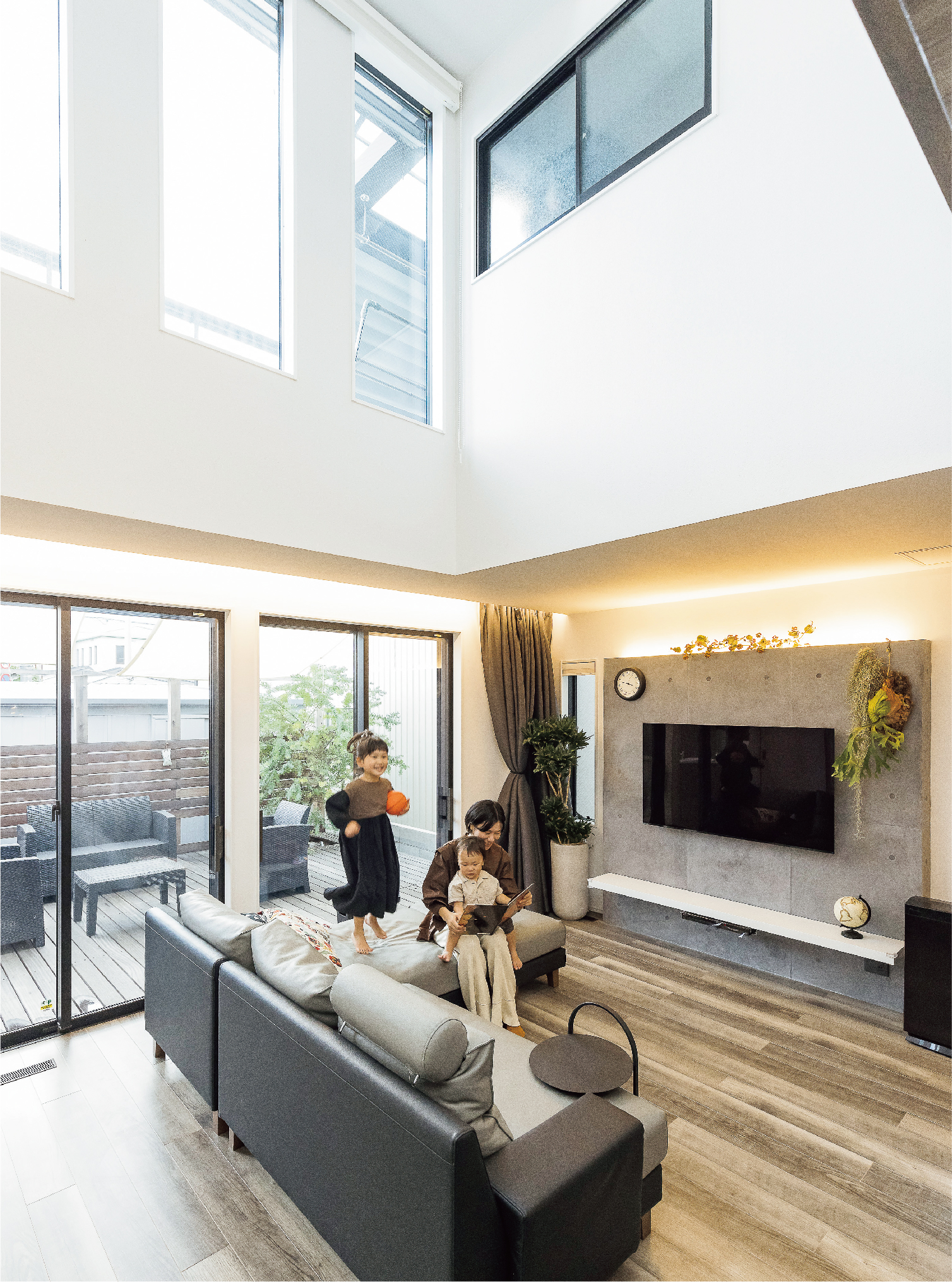 リビング南側に大きな吹抜けを設け、上下に4つの大開口を配置。たっぷりの光に包まれる明るい空間に。