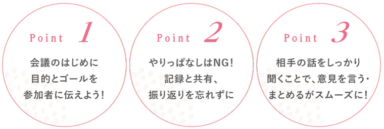 3つ目は、主催者が話を聞く姿勢です。腕組みやふんぞり返るような姿勢はNG。椅子に浅く座る、あいづちを打つなど「意見を聞きたいです」と態度でも示すことで、参加者も協力的になります。