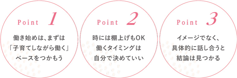 「働きたい気持ちもあるけど、家族に迷惑をかけたくない」という声もよく聞きます。そんな時は、「何を嫌だと感じているのか」を具体的に考えてみて。たとえば、夫が「自分は鍵っ子で寂しかった」というなら、子どもの帰宅時間に帰れたり在宅で仕事ができるなどと落としどころを探したりもできます。ひょっとしたら、「家族は迷惑とは思っていない、本当は自分がそうしたいんだ」と子育てで自身が大切にしたいポイントに気づくかもしれません。