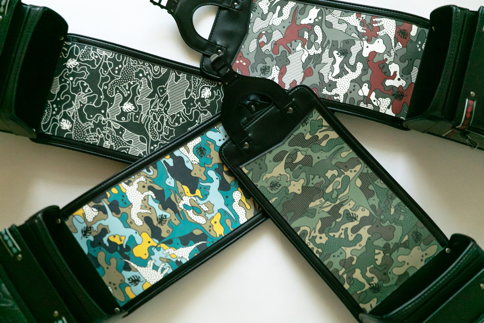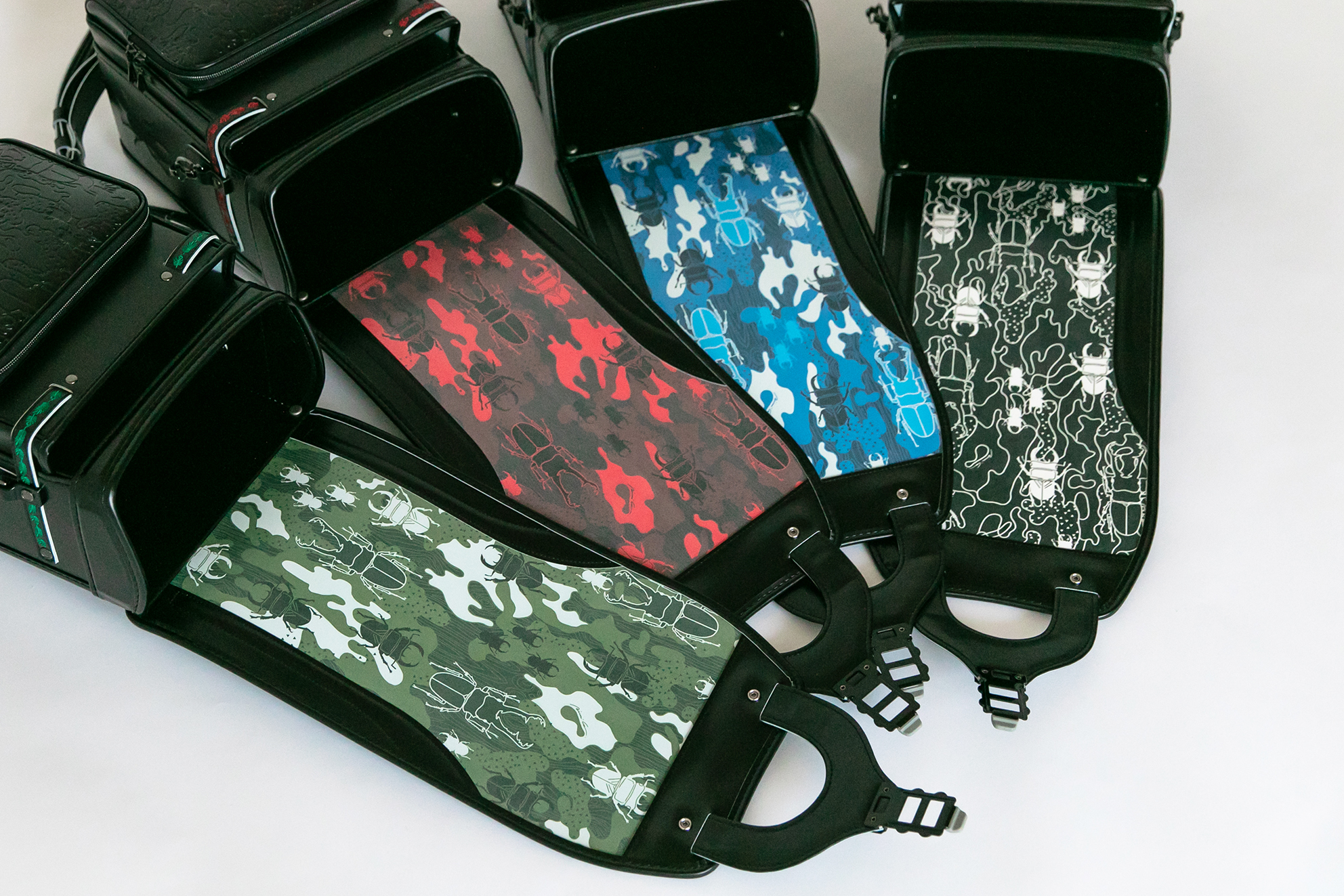 【カブトムシランドセル】は、幾何学迷彩柄の中にエレファスゾウカブト・ヘラクレスオオカブト・大和カブトムシが描かれており、色はレッド・ブルー・ブラック・イエローの4種類。