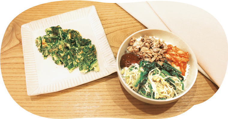 今回の献立は、「ホウレンソウ」を使い切る、「ホウレンソウのビビンバ風丼&ホウレンソウのチヂミ」です。