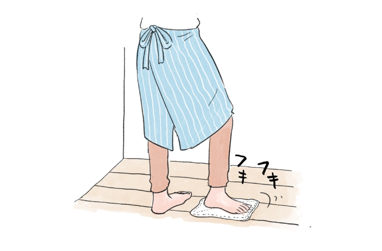 素足で過ごす夏は床がとにかく汚れやすいので、水拭きはしょっちゅうしたいところ。だから、濡らしたウエスを用意して、料理ついでにキッチンの床を足でゴシゴシ。移動ついでにリビングの床を足でゴシゴシ。素足だからなせるワザ!(お行儀悪くてスミマセン)
