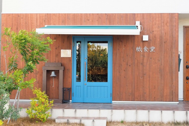 ブルーのドアと「織食堂」の美しいロゴが目印