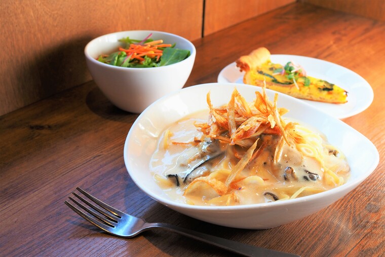 「牡蠣とキノコ、白ネギのペペロンチーノ 濃厚鶏だしエスプーマ仕立て ごぼうのフリット添え」1199円(税別)