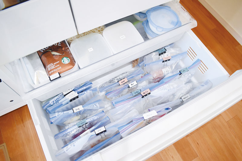 冷凍食品は、立てて収納しましょう。上部をクリップでとめ、ラベルを貼り、食品名を書きます。肉はピンク、魚は青など、色分けしておけば探しやすく買い足しもスムーズです。