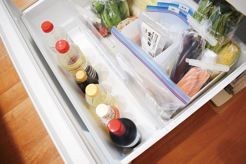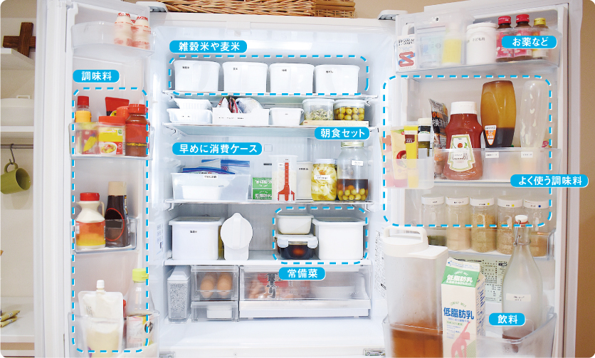 冷蔵庫を開けてすぐ目に入る部分には、賞味期限が近い食品をケースにまとめて置きます。他の調味料や常備菜などは、在庫がどのくらいあるか一目でわかるよう定位置を決めて。