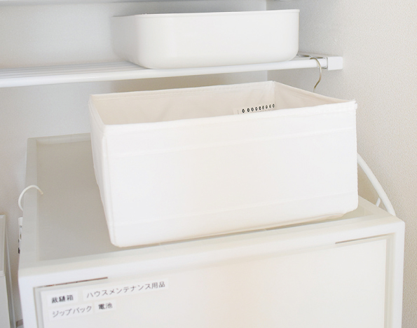 リビングクローゼットの中にも、折りたためるケース。「借りた本」や「来週学校に持たせる工作材料」「開封前の日用品」など、置き場所が特に決まっていないものを入れて、リビングが散らかるのを防いでいます。