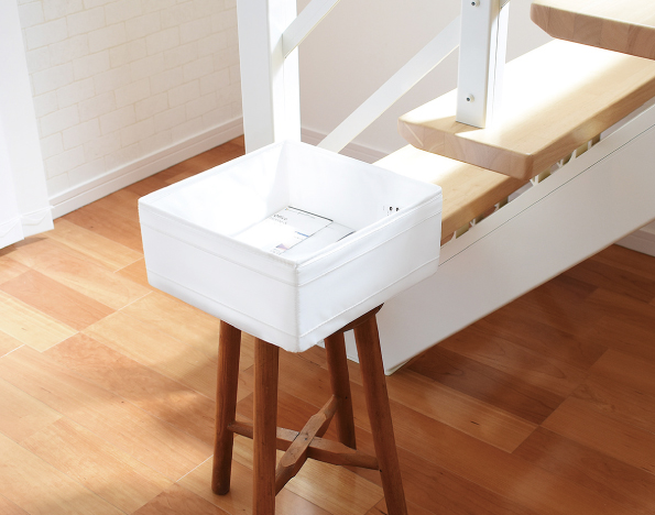 階段の脇にスツールに載せたケースを置いて、「2階に持っていくもの」や「洗濯してたたんだ服」などの一時置きにしています。こうやって置いておくと、気づいた家族が2階の自分の部屋に持って行ってくれることも。