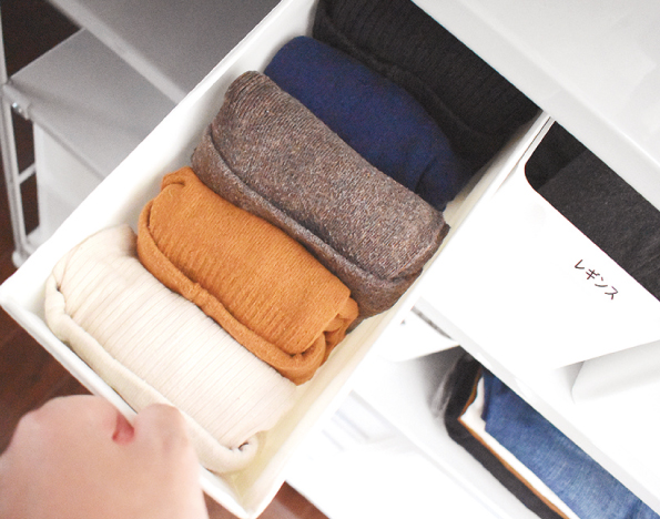 折りたたみケースは、衣類の収納にも重宝。冬に厚手タイツをしまったケースは、衣替えと同時にたたんで、夏はタイツと一緒にかたづけています。また、「クリーニングに出す衣類」の一時置きにも活躍しています。