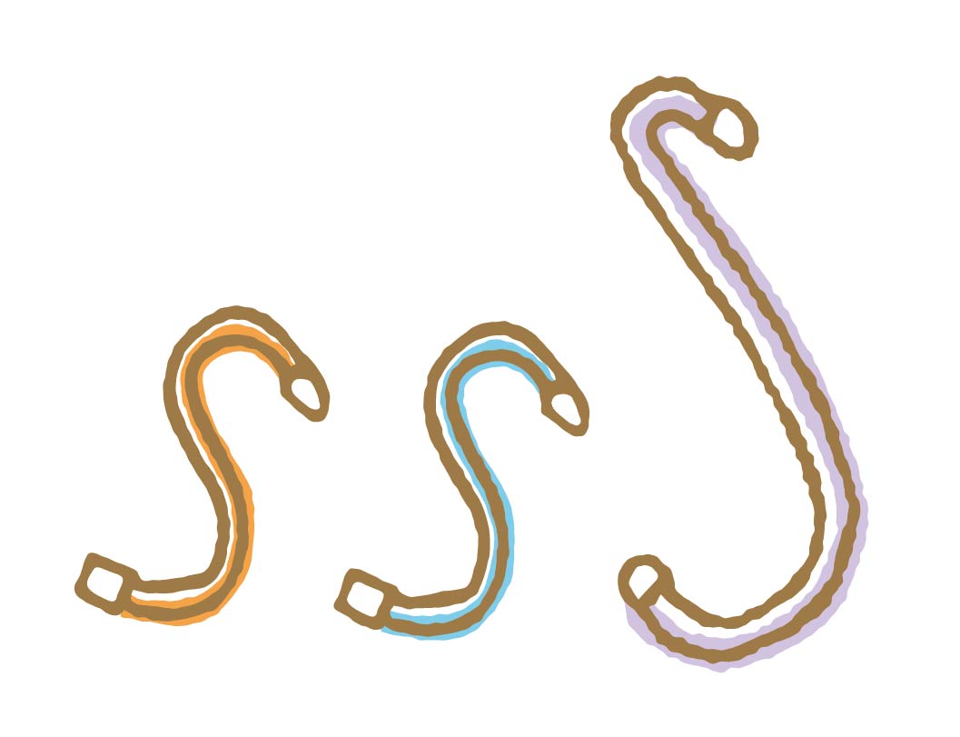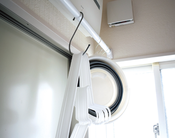 片方が大きくカーブしたS字フックは、たくさんのものをいっぺんに引っかけるのに便利。洗濯機の上に渡したつっぱり棒にかけて、ハンガーをまとめて収納するのに使えば、絡まらずにパッと使えておかたづけも簡単です。