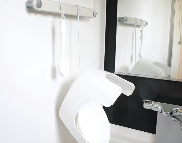 浴室では、長いS字フックが活躍します。浴室用のイスと洗面器を一緒に引っかけて収納すれば、カラッと乾いて衛生的。もちろん、掃除用のブラシも、S字フックにかけて収納しています。
