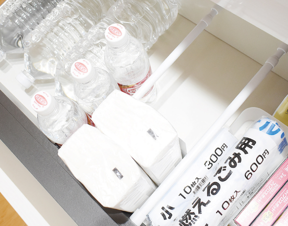 キッチンの大きな引き出し収納は、ペットボトルやレトルト食品のストックで活躍しますね。でも、ちょうどぴったり仕切れるケースがない…そんな時は短めのつっぱり棒が便利。ケースを探す手間をかけず、サイズ調節できるので収納の時短に!