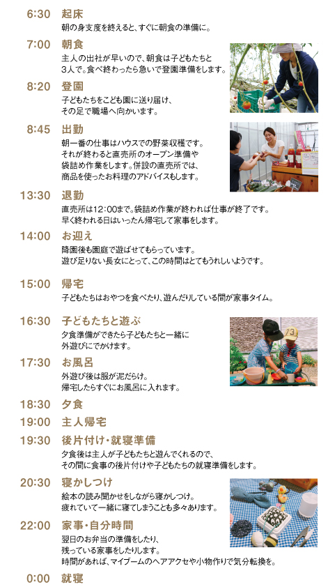 ITを駆使した農業を展開する会社で、野菜の収穫や販売などをしています。この仕事をはじめたのは、主人の同級生でもある社長から声をかけてもらったことがきっかけです。当時は長女がまだ2歳前で、仕事に復帰するか悩んでいたのですが、「週3~5日、1日3~5時間程度の仕事」であると聞き、無理なく働けそうだと感じて入社しました。