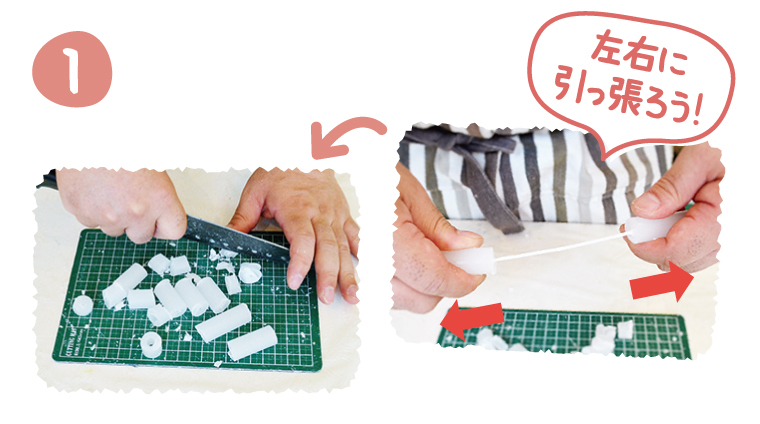 ロウソクを真ん中で割り、左右に引っ張って中の芯を引き抜く。