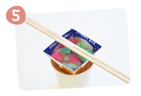 ツリーの型を逆さにして紙コップに入れ、割箸で芯を挟んで固定する。