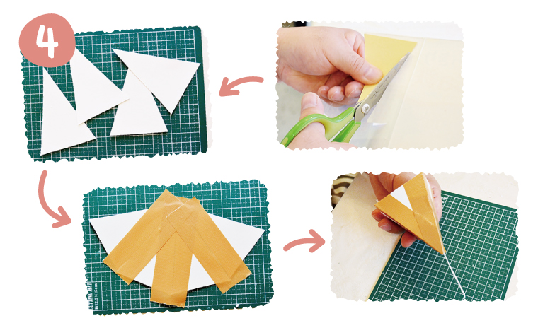 牛乳パックを三角形に切り抜いたものを4枚つくり(三角の型を当てて切り抜くといい)、