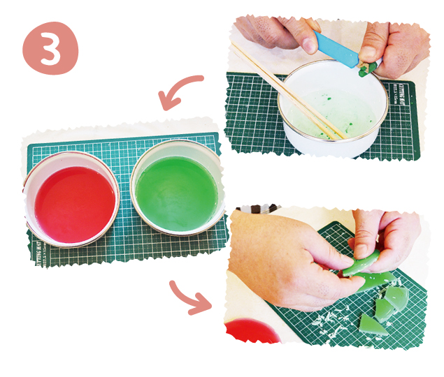 ②の一部を容器にうつし、クレヨンを少々、カッターで削り入れて混ぜ溶かす。