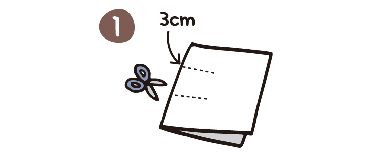 画用紙を半分に折って、はさみで3cm位の切りこみを入れる。
