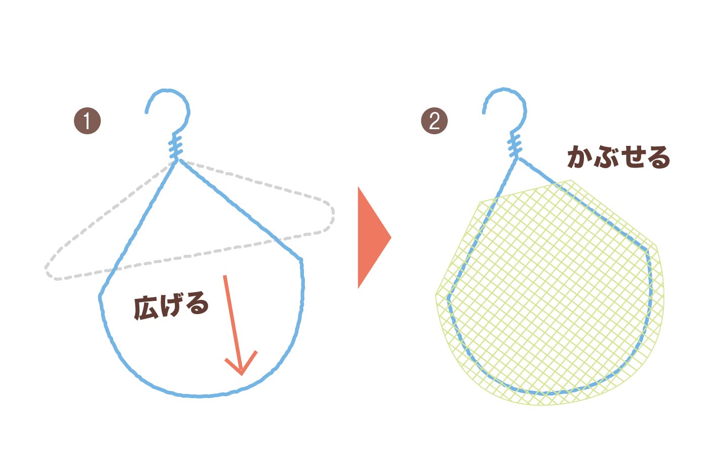 ❶針金ハンガーを広げて、うちわ状にし、骨組みをつくる。