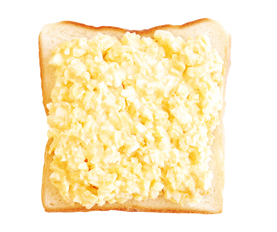 - 食パンにバターを塗り、①でつくった具材を、真ん中を盛り上がるようにのばし、もう一枚のパンをのせる。