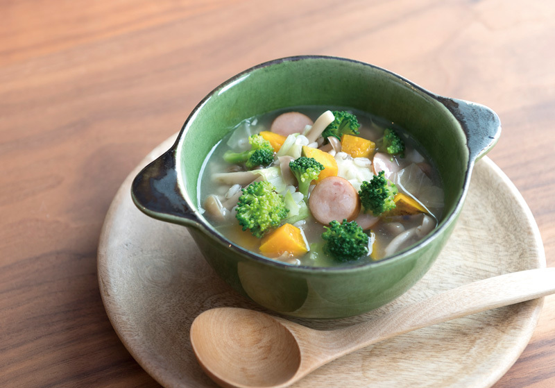 - 押し麦が柔らかくなったら、カボチャとブロッコリーを加えてひと煮立ちさせる。塩・コショウで味を整える。