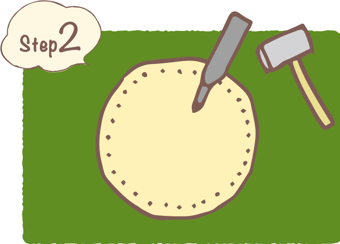 カッターマットの上にStep1で切り取った革を載せ、端から5mm内側に、等間隔に32カ所、穴あけポンチとかなづちで穴を開ける。