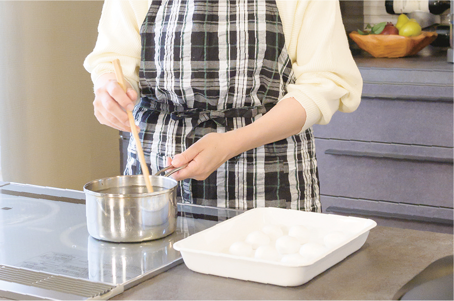 ❹ 鍋に沸かしたお湯の中に③を入れ、中火で茹でる。浮き上がってきたら、さらに3分間茹でる。