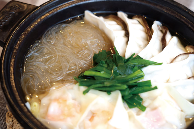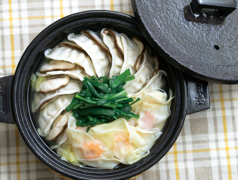 ❸ 鍋に★を入れて煮立ったら、白菜・シイタケを加え、火が通ってから餃子・ワンタンを加える。皮が透き通って浮き上がり、火が通ったらニラを加えて3分程煮込み、ゴマ油を加えて仕上げる。