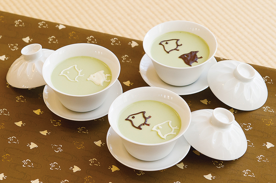 - 鍋に牛乳とグラニュー糖を入れ中火にかける。沸騰寸前で火からおろし、ゼラチンと抹茶を加えてよく混ぜる。