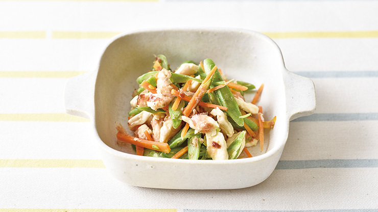 ❶サヤインゲンは斜め薄切り、ニンジンは千切りにする。鶏ささみは筋を取り、野菜と同じような形状に切る。